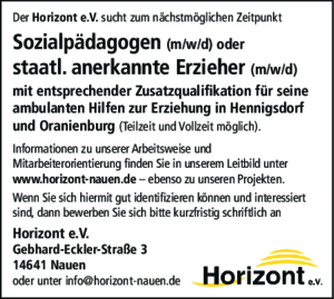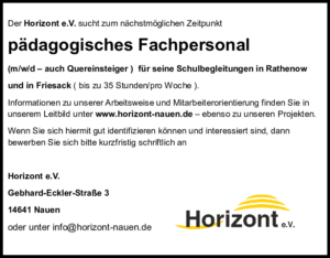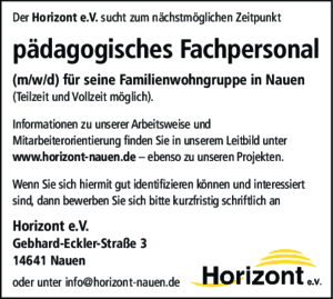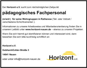Wir suchen ständig Mitarbeiter:innen und Praktikant:innen. Gern auch Initiativbewerbungen. Für unsere Jugendhilfeeinrichtungen und Projekte suchen wir flexible und motivierte Menschen! Der HORIZONT e.V. Nauen stellt seit 1991 als anerkannter Träger der freien Jugendhilfe auf der Grundlage des SGB VIII und des JGG verschiedene ambulante und stationäre Angebote bereit. Fühlen Sie sich angesprochen, freuen wir uns auf Ihre Bewerbung.